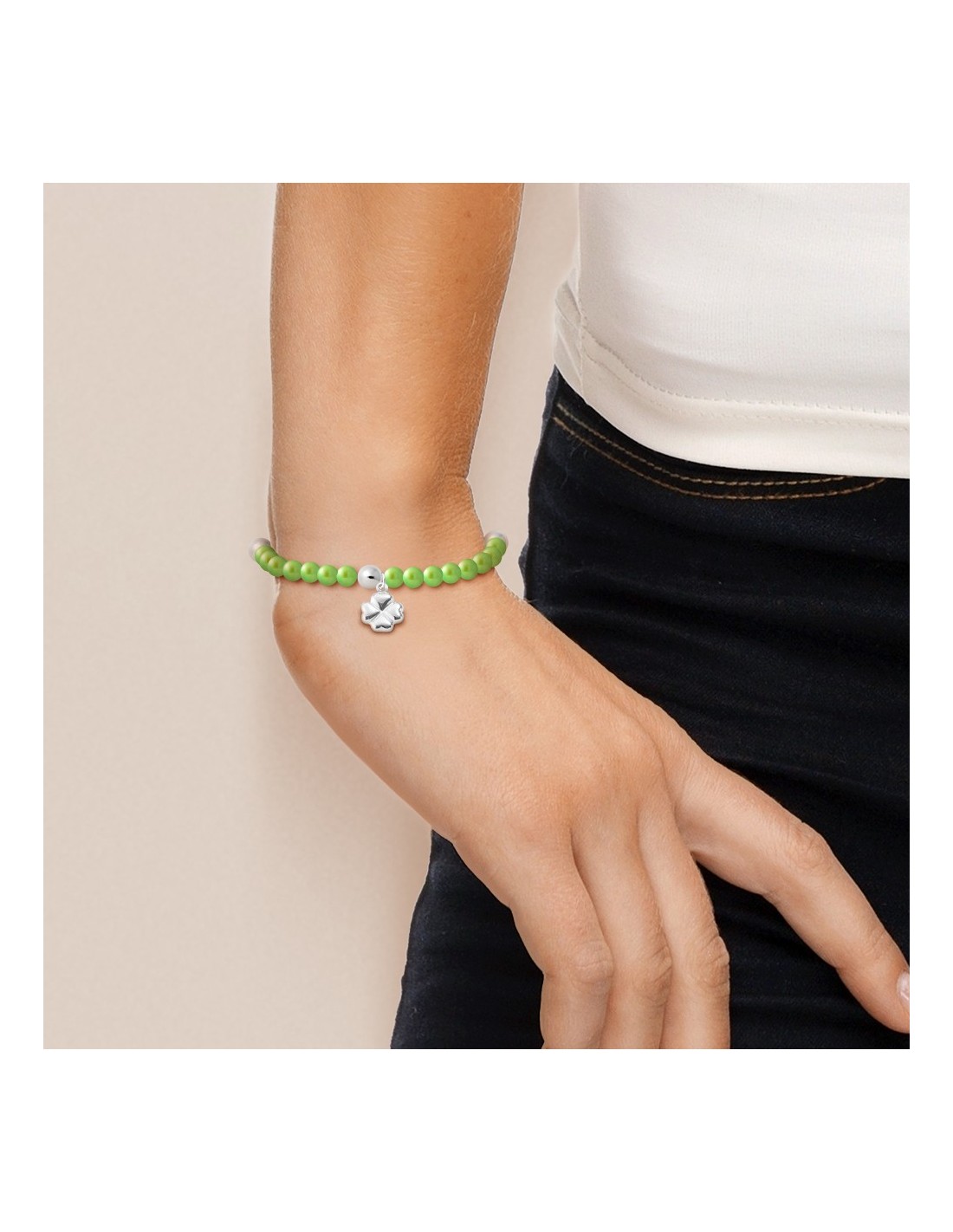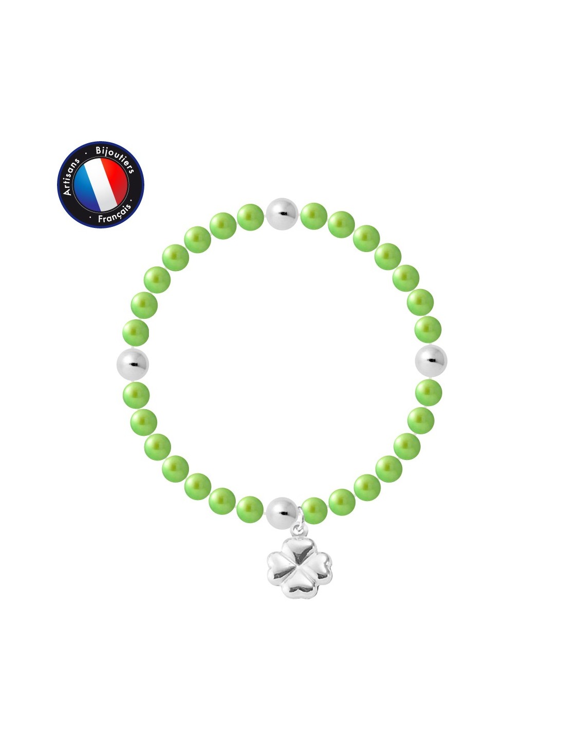 Bracelet- Véritables Perles de Culture d'Eau Douce- Colori Vert Tonic- Diamètre 5-6 mm- Qualité de la Perle : AAA+- Breloque TrŠfle & 4 Viroles- Argent 925 Millièmes- lastiqu‚ / Longueur 18 cm- Livré dans un écrin Prestige et accompagné d'un Certificat d'Authenticité et de Garantie- Fabriqué par nos Artisans Bijoutiers Français- Garanti 2 ans contre tout défaut de fabrication Internationale