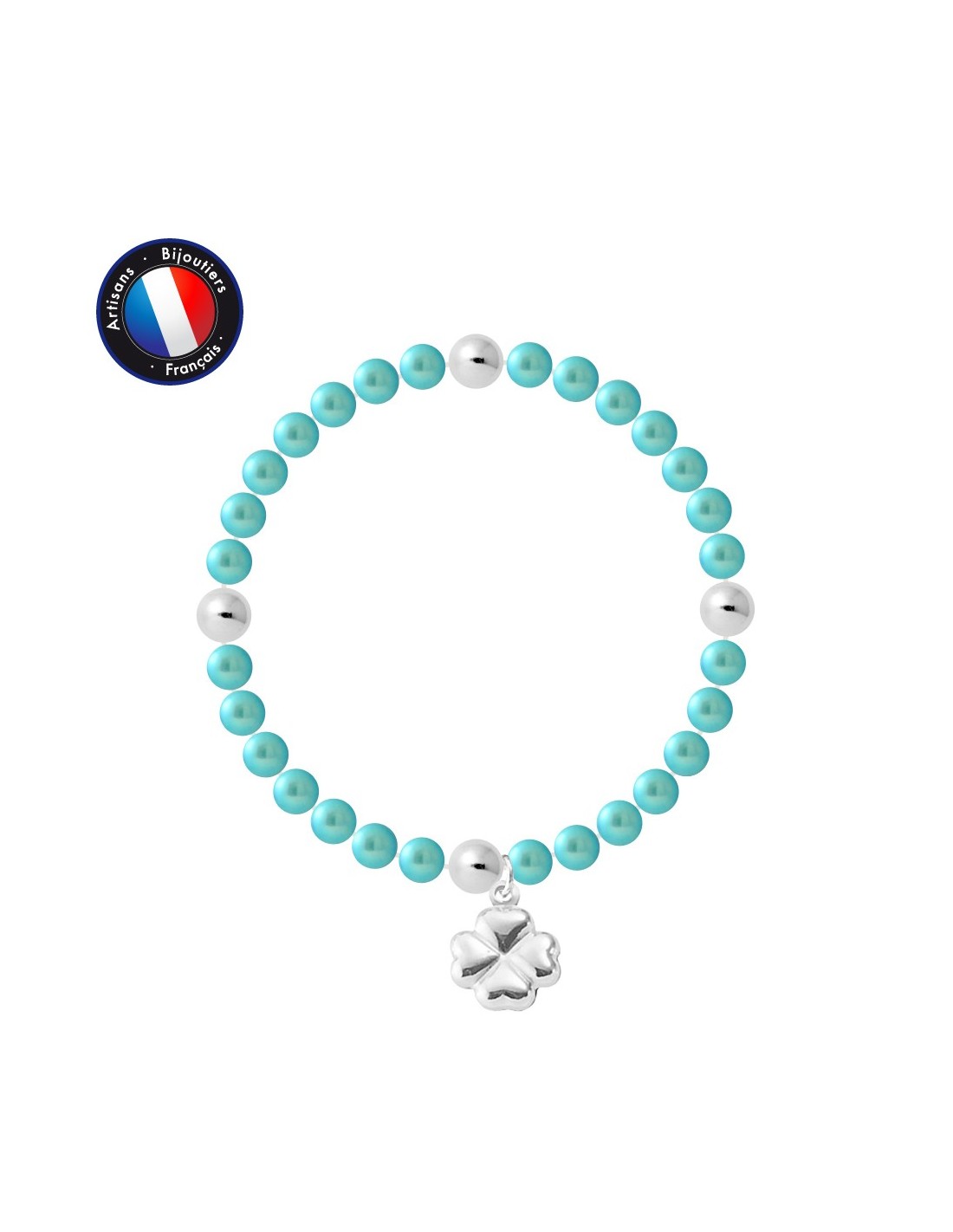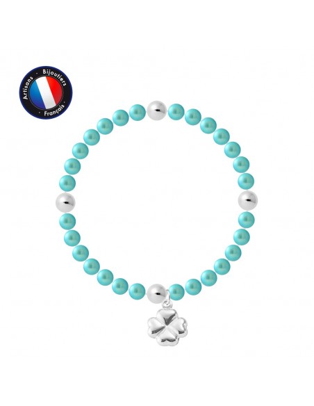 Bracelet- Véritables Perles de Culture d'Eau Douce- Colori Bleu Turquoise- Diamètre 5-6 mm- Qualité de la Perle : AAA+- Breloque TrŠfle & 4 Viroles- Argent 925 Millièmes- lastiqu‚ / Longueur 18 cm- Livré dans un écrin Prestige et accompagné d'un Certificat d'Authenticité et de Garantie- Fabriqué par nos Artisans Bijoutiers Français- Garanti 2 ans contre tout défaut de fabrication Internationale