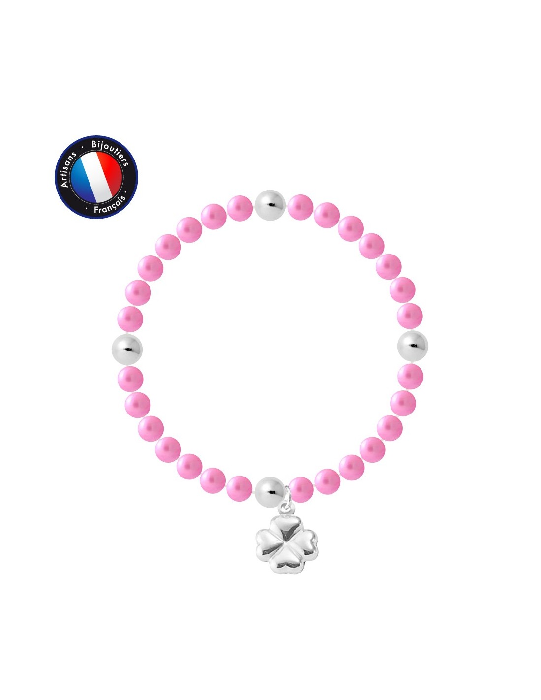 Bracelet- Véritables Perles de Culture d'Eau Douce- Colori Rose Fushia- Diamètre 5-6 mm- Qualité de la Perle : AAA+- Breloque TrŠfle & 4 Viroles- Argent 925 Millièmes- lastiqu‚ / Longueur 18 cm- Livré dans un écrin Prestige et accompagné d'un Certificat d'Authenticité et de Garantie- Fabriqué par nos Artisans Bijoutiers Français- Garanti 2 ans contre tout défaut de fabrication Internationale